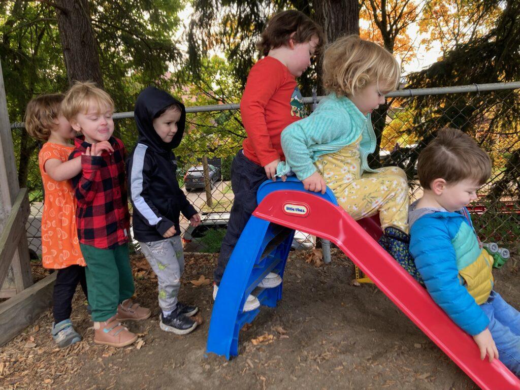We still spend lots of time outside. As the weather gets cold, and wet, we may be inside longer each day but will try to spend plenty of time outside. Please make sure your child has warm clothes to make them comfortable. If it is pouring, drop-off and pick-up may be in the building.
